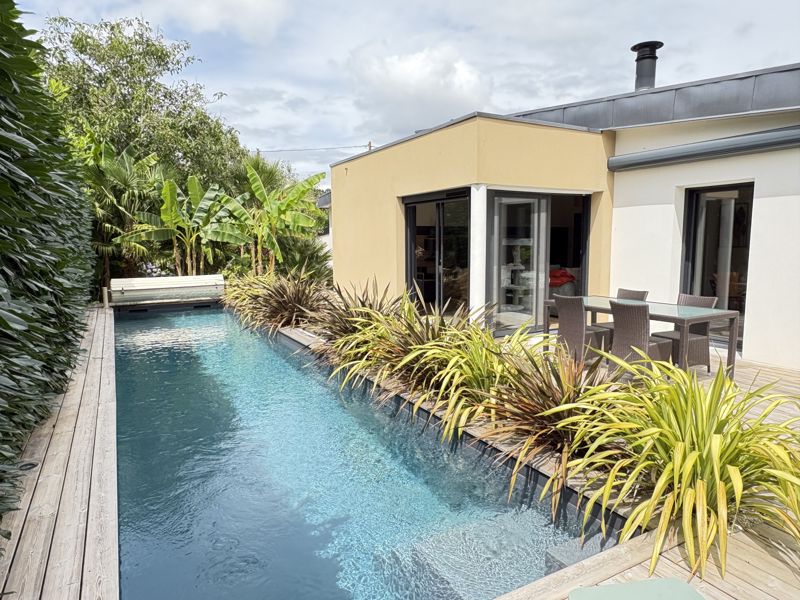 Découvrez cette superbe maison contemporaine de plain pieds construite en 2011, pensée pour le confort et la convivialité. Vous serez séduit par son vaste séjour baigné de lumière, parfait pour partager des moments en famille ou entre amis. La cuisine, entièrement aménagée et équipée, ravira les amateurs de gastronomie et de réceptions. Côté nuit, trois belles chambres vous attendent, dont une somptueuse suite parentale avec salle d’eau privative, offrant un espace intime et raffiné. À l’extérieur, une grande terrasse s’ouvre sur une magnifique piscine, idéale pour se détendre, nager ou profiter des beaux jours en toute intimité. La piscine, véritable atout de cette propriété, promet des moments de plaisir et de détente pour toute la famille est chauffée par une pack indépendante. Le tout est implanté sur un terrain de 1105 m2, garantissant calme et intimité. Cette maison est une invitation à savourer chaque instant, dans un cadre privilégié et moderne. Ne manquez pas cette opportunité rare !