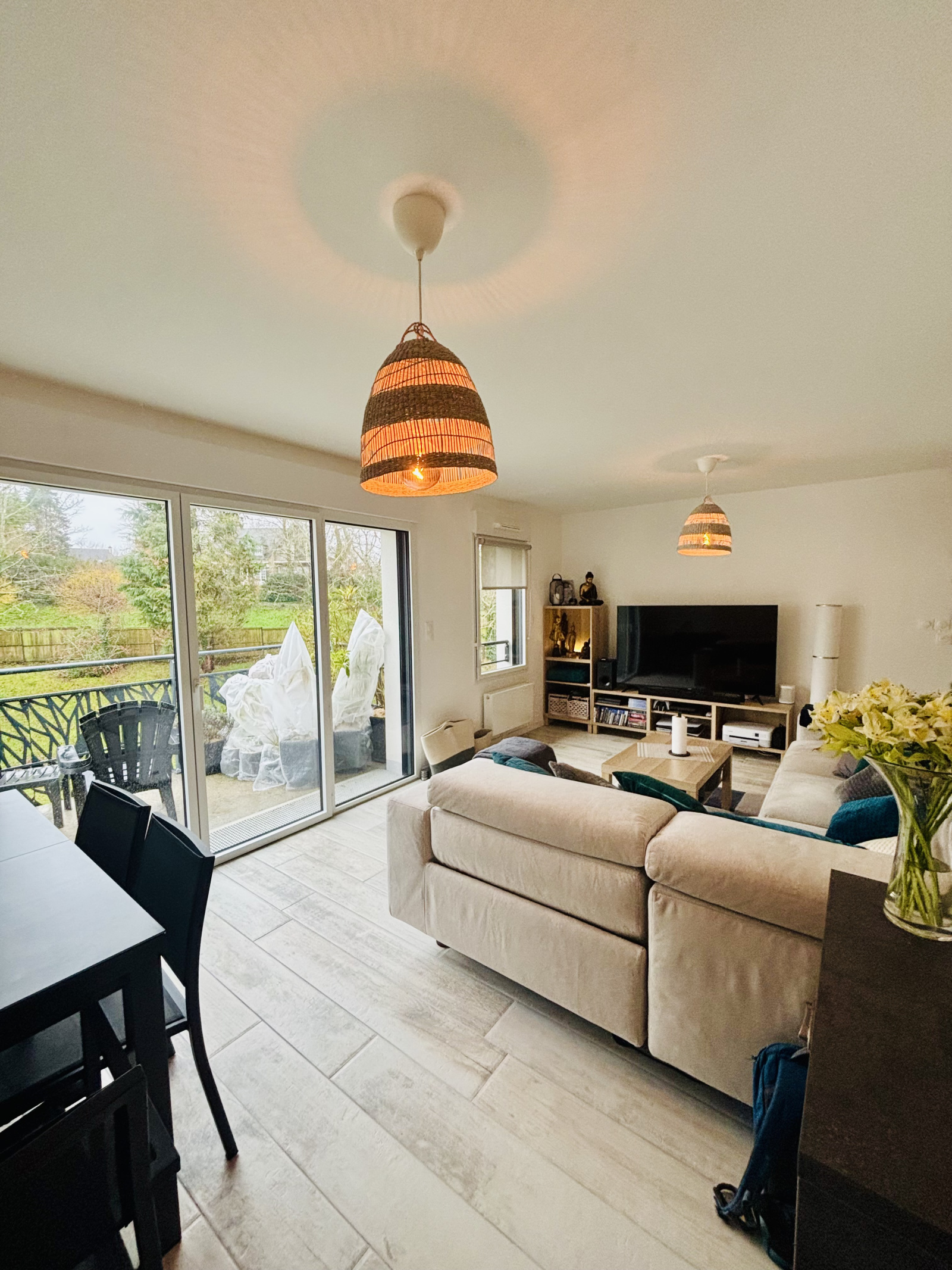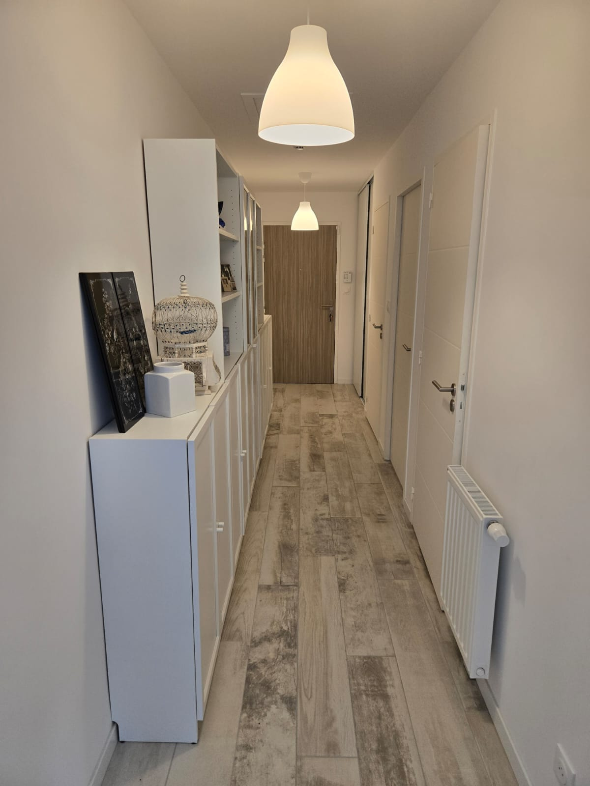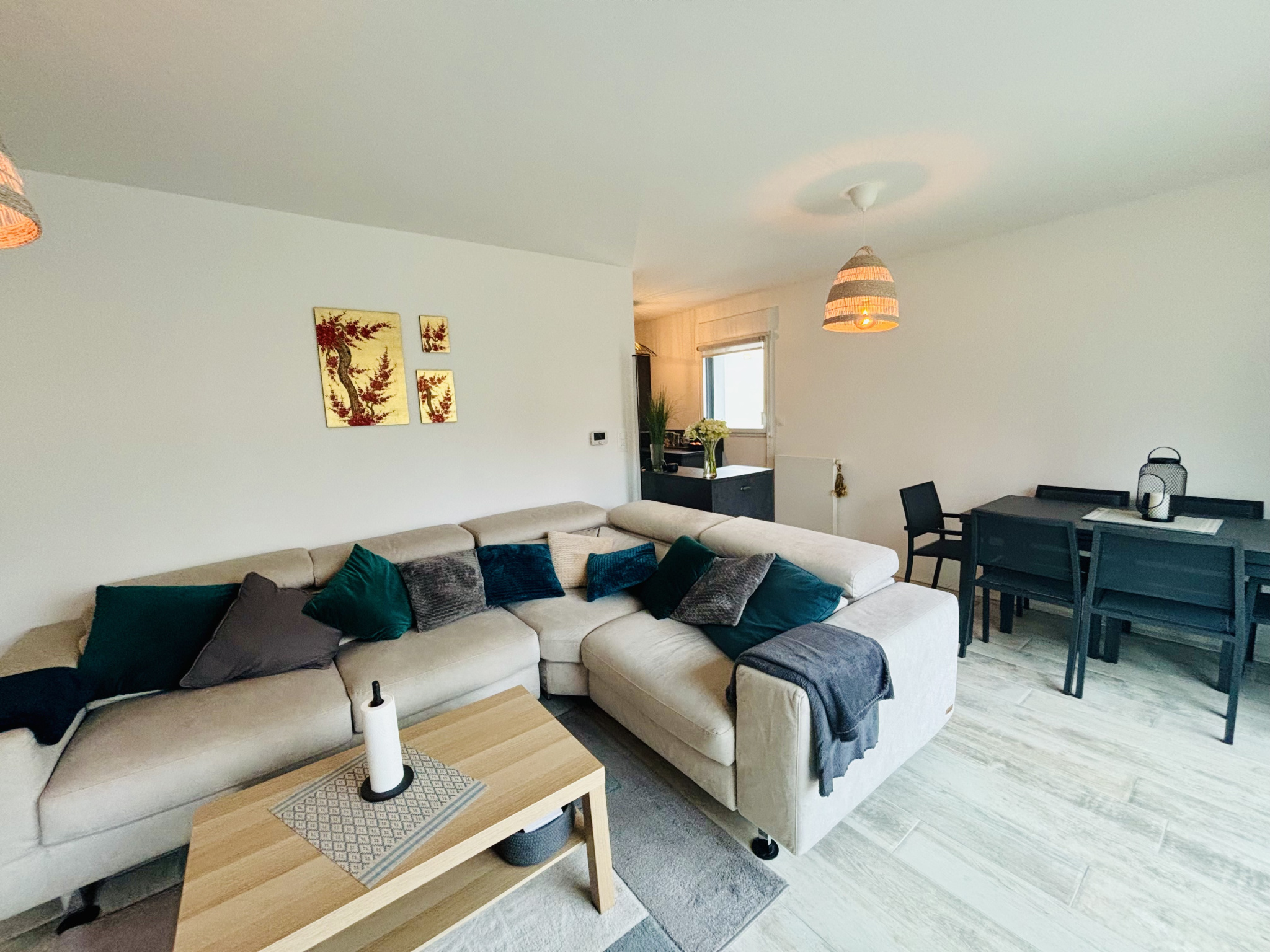 Grande entrée avec placard, salon séjour lumineux donnant sur un balcon d'environ 10m², cuisine ouverte, entièrement aménagée et équipée, deux chambres dont une avec dressing, une salle d'eau avec espace buanderie et un WC séparé.