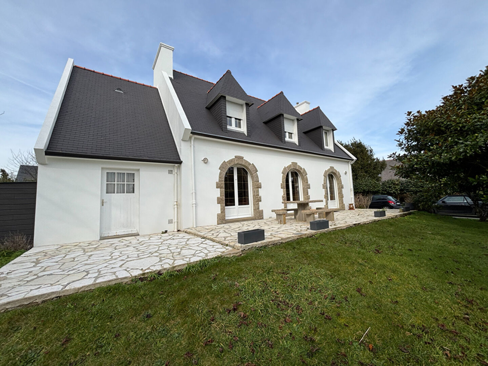 découvrez cette belle maison d'architecture néo-bretonne des années 70. Située dans le bourg à quelques pas du centre ville de Fouesnant et de ses commodités. Ce bien est construit sur un terrain de 1694m² dans lequel le calme et la sérénité règne. Au rez-de-chaussée, on peut retrouver une grande entrée amenant un beau séjour doté d'une cheminée qui donne cet atmosphère chaleureux. La cuisine aménagée et équipée quand à elle plaira aux amateurs de convivialité. On y retrouvera aussi une chambre avec placards, un W.C séparé ainsi qu'une terrasse. A l'étage, un grand couloir dessert 4 chambres allant de 10 à 20 mètres carrés, parfait pour les grandes familles ou pour accueillir des amis. On y retrouvera aussi une salle de bain ainsi qu'un W.C séparé. Cette maison contient aussi 2 garages