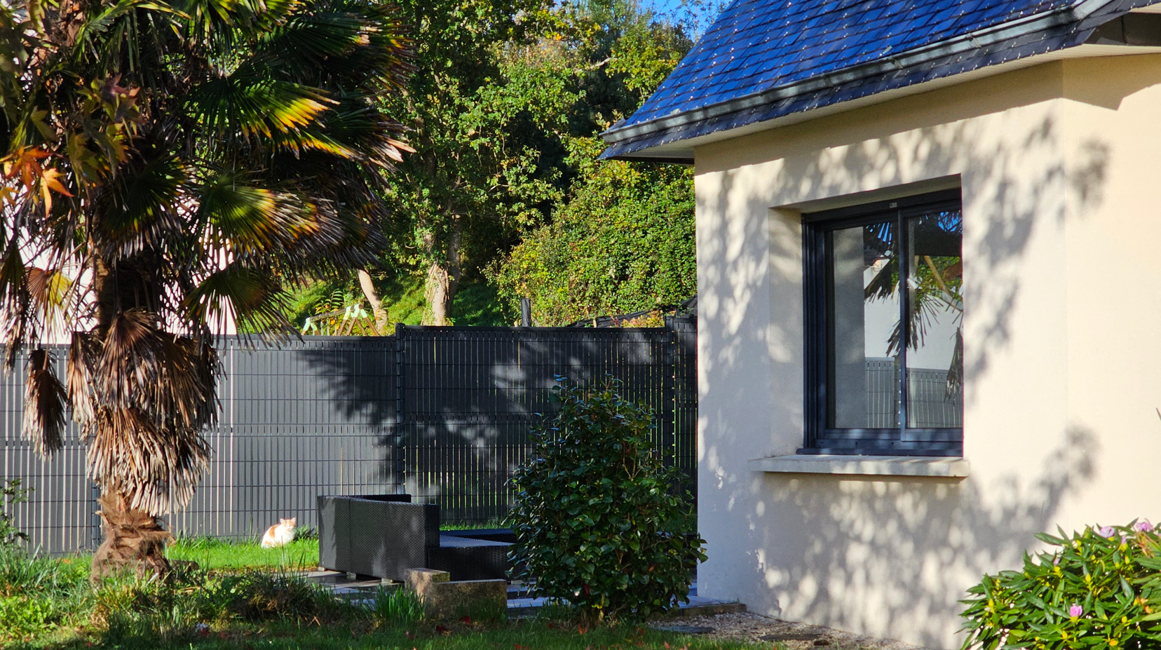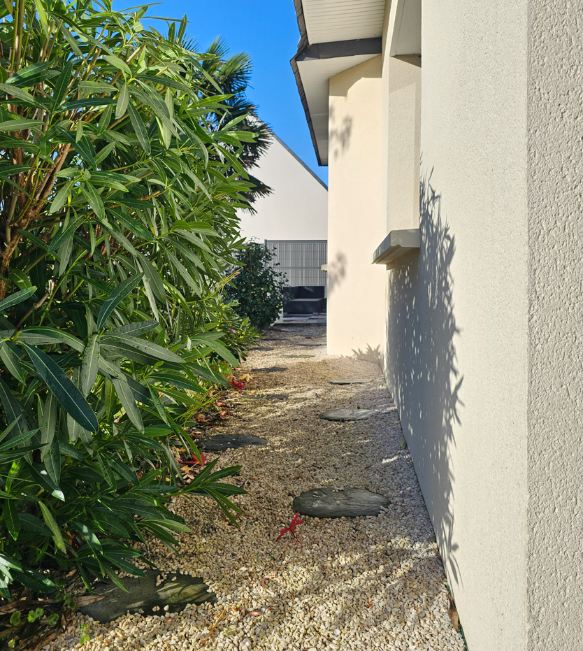 Terrain entretenu de 656 m², belle allée donnant accès au large parking et son garage.