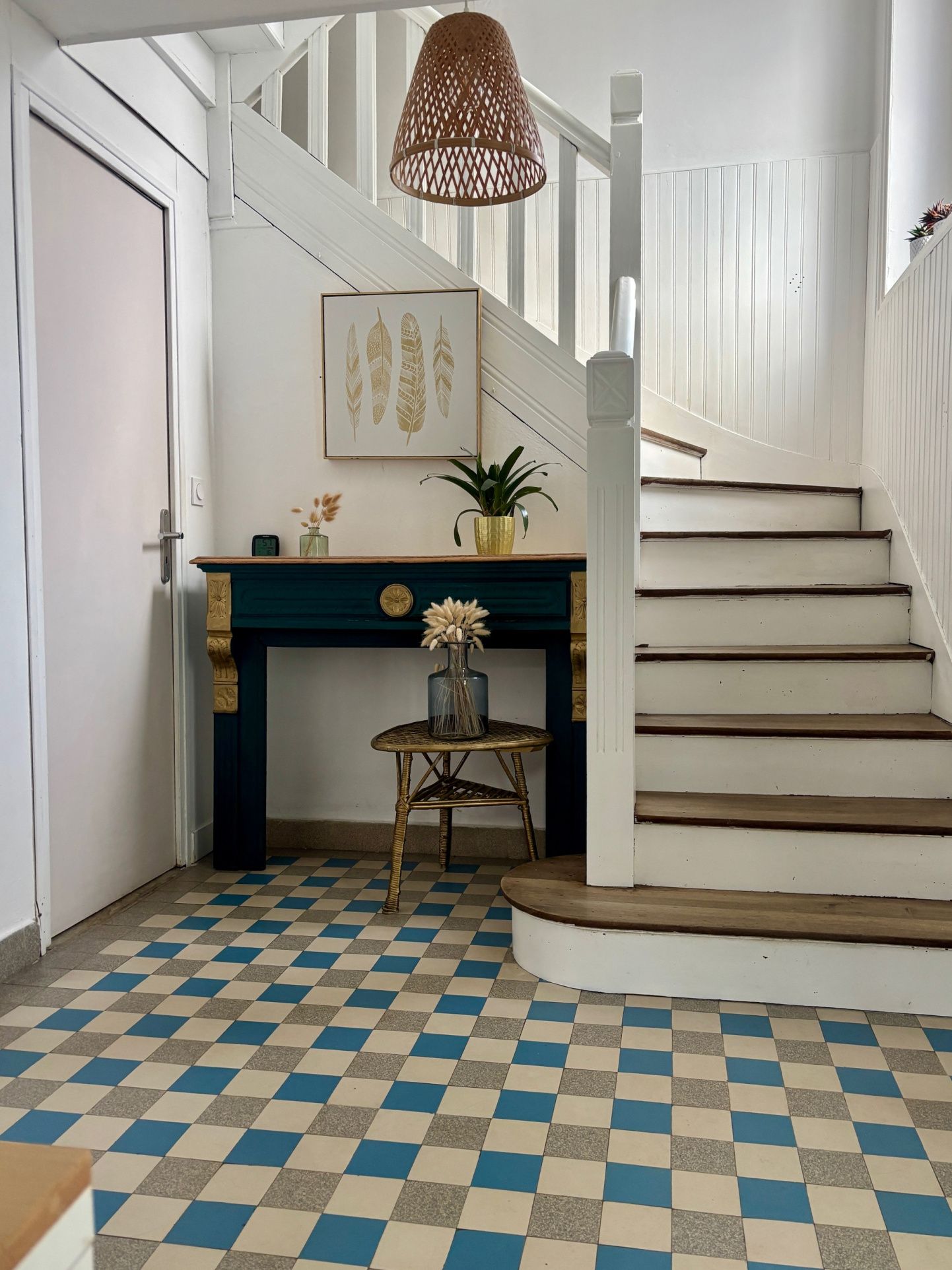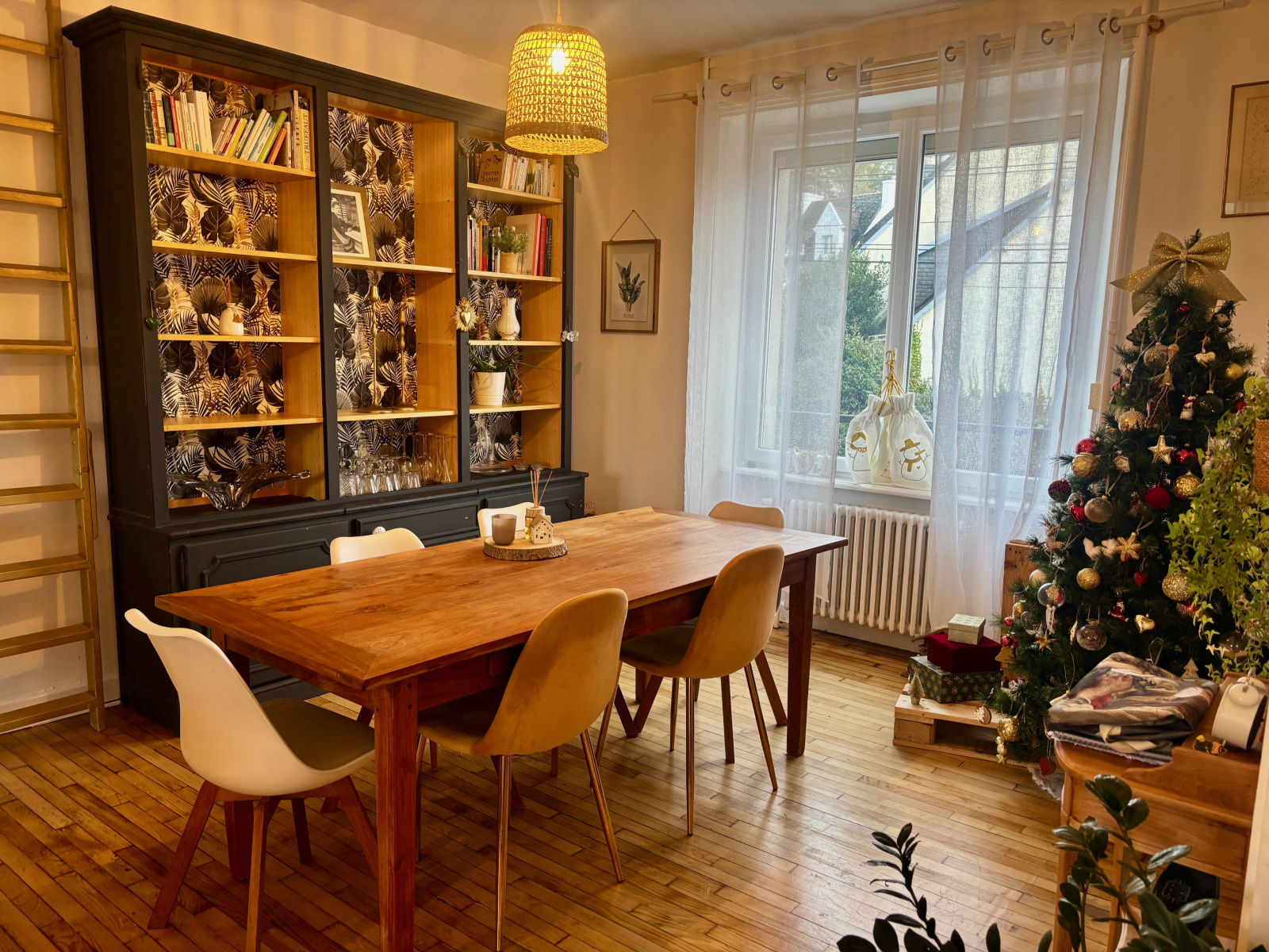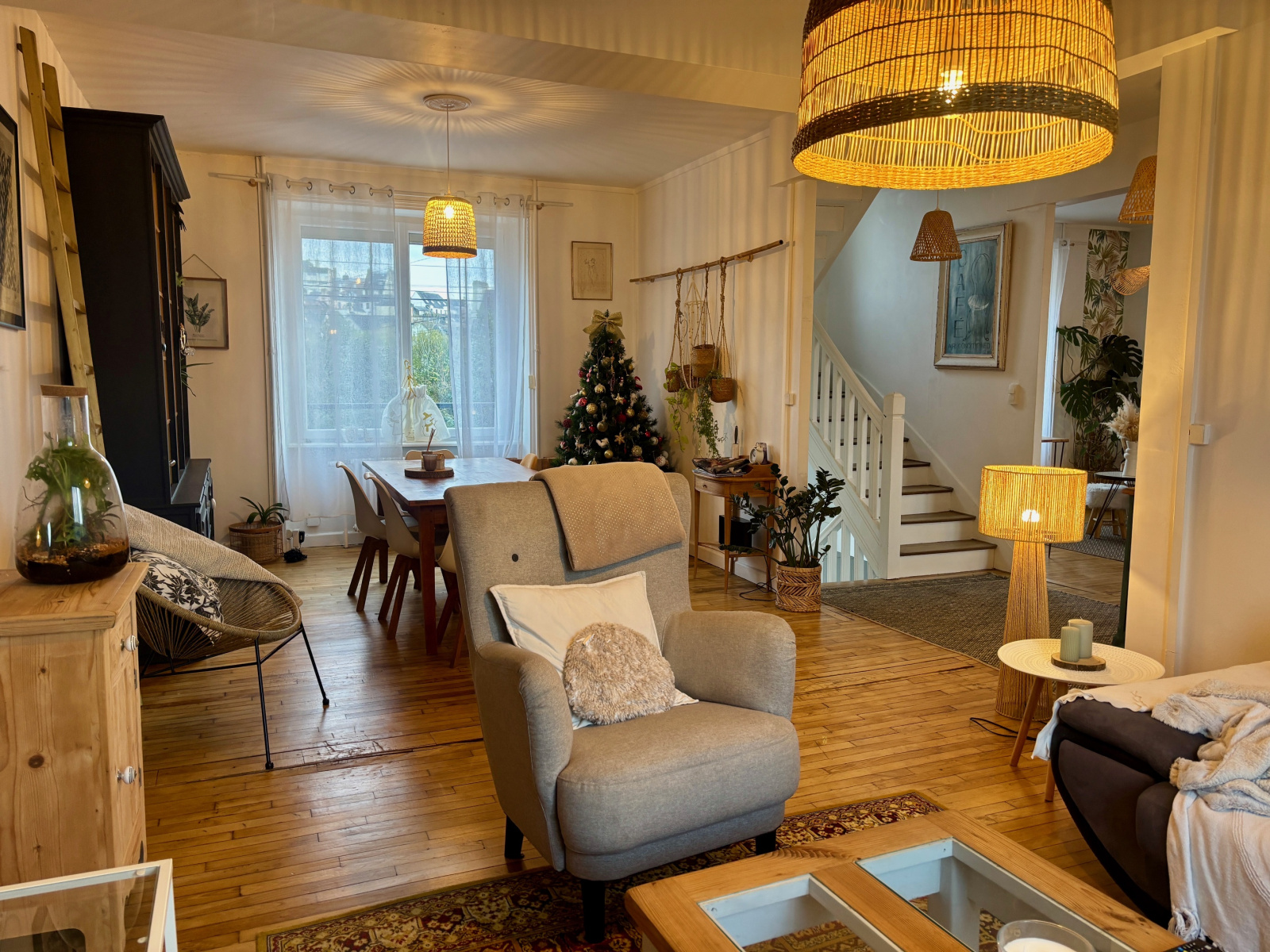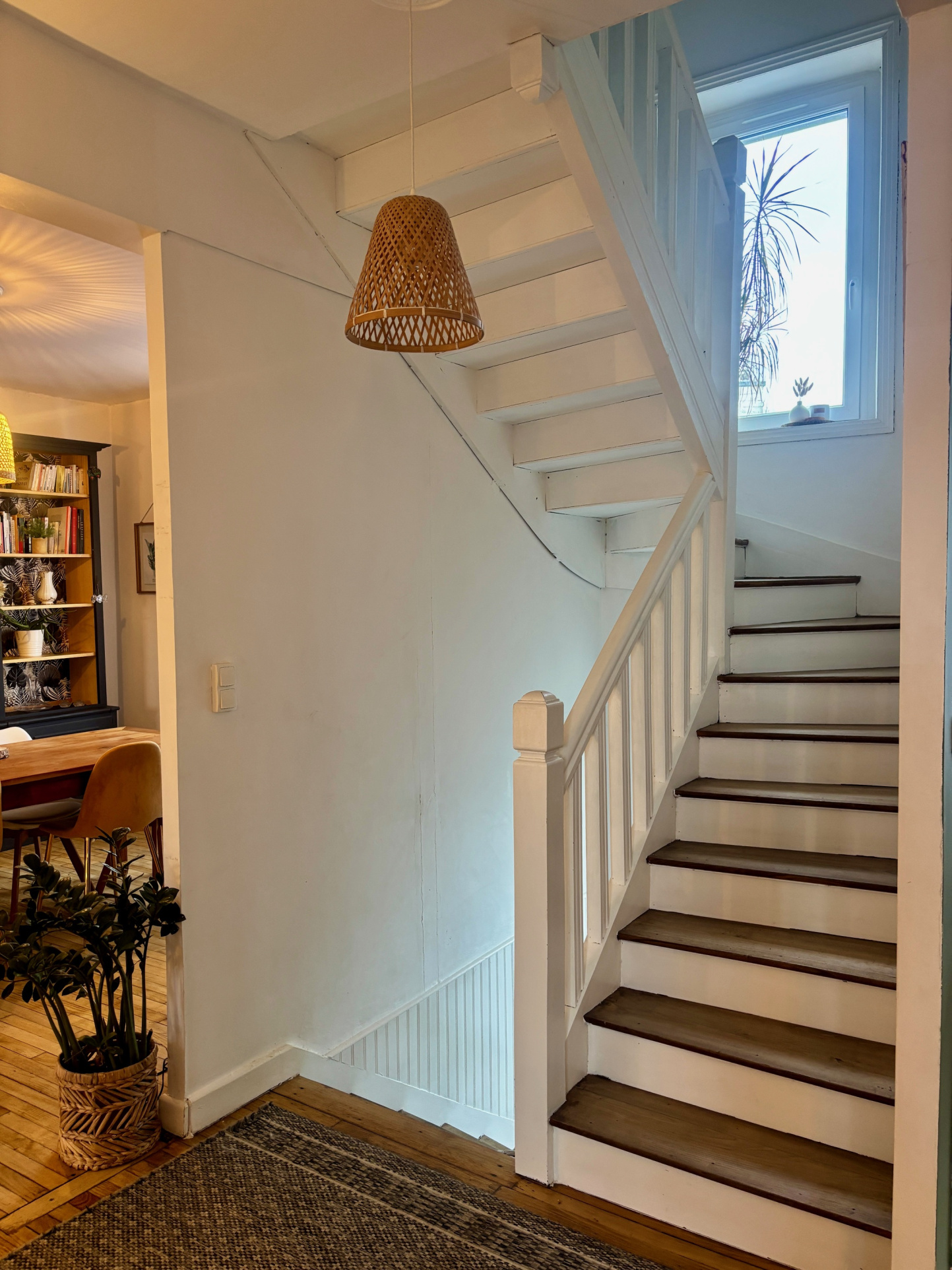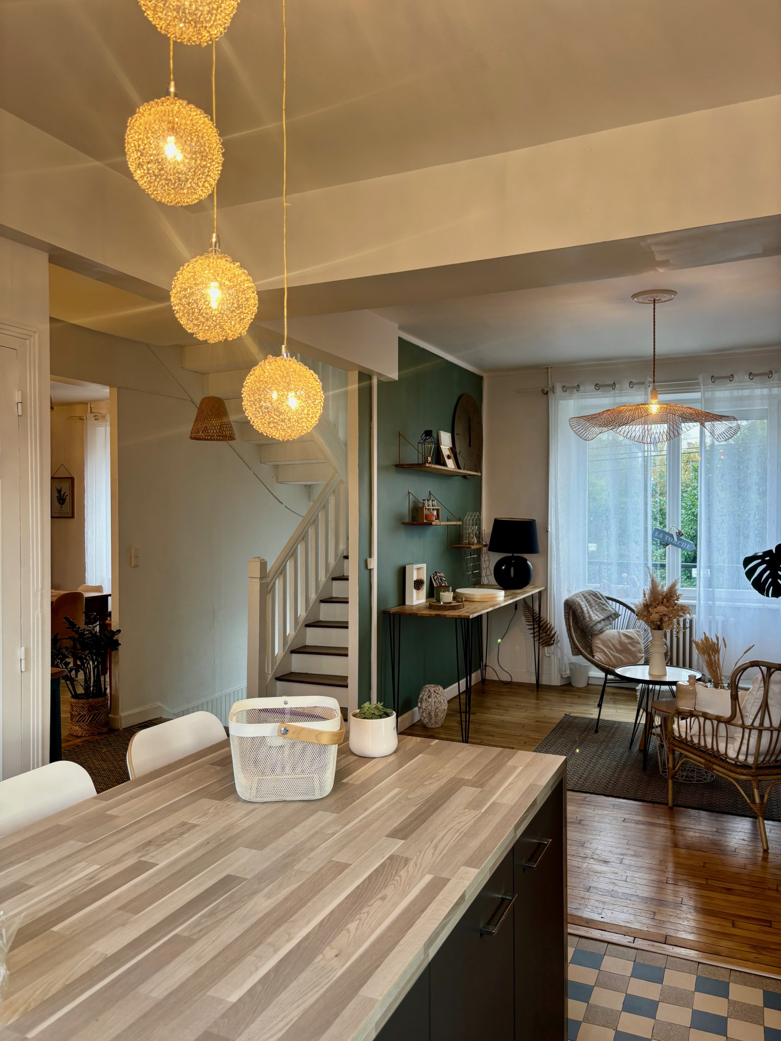 Au niveau de vie principal, le charme opère immédiatement grâce aux parquets d’origine et aux carreaux de ciment anciens.