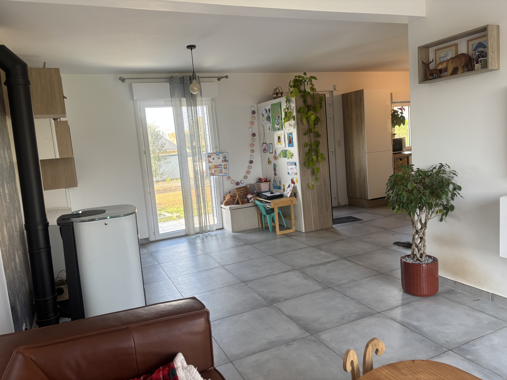Au rez-de-chaussée : Salon-séjour avec poêle à granulés, cuisine aménagée et équipée, chambre, WC, buanderie, cellier, local technique.